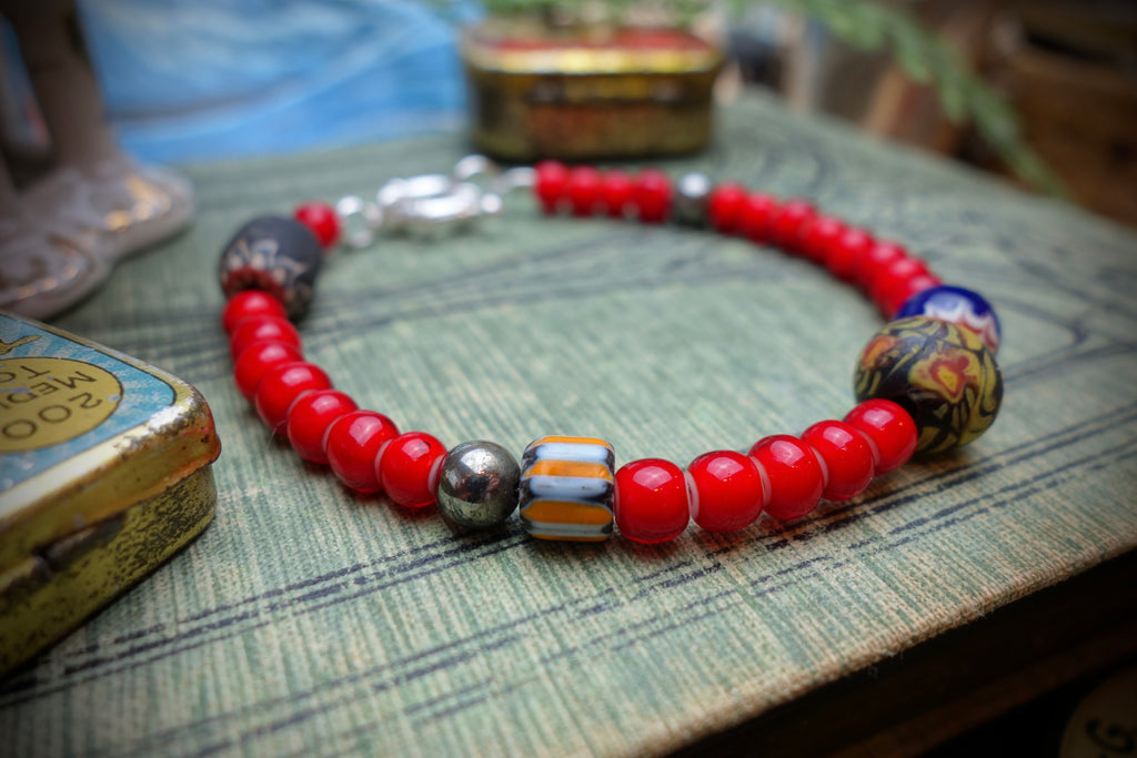 This beautiful bracelet is made with old bohemian glass beads from the 1920s/1930s and Venetian glass pearls which are over 100 years old. Combining bright red color with yellow and blue is eye-catching! Inbetween two nice Pyrite stones found their place. A huge and timeless 925 sterling silver clasp is holding this bracelet securely on your wrist. The total length is 20cm. Please measure your wrist carefully. You can use a cord or something similar to measure your correct wrist size. The bracelet should fit neither to loose nor too tight. Bead size is approximately 5mm-6mm (red beads) to 10mm (yellow bead in center). It can be worn by women and men.