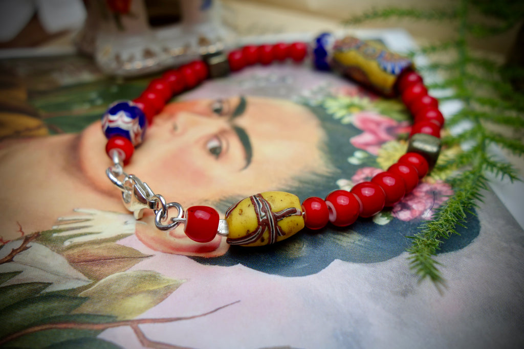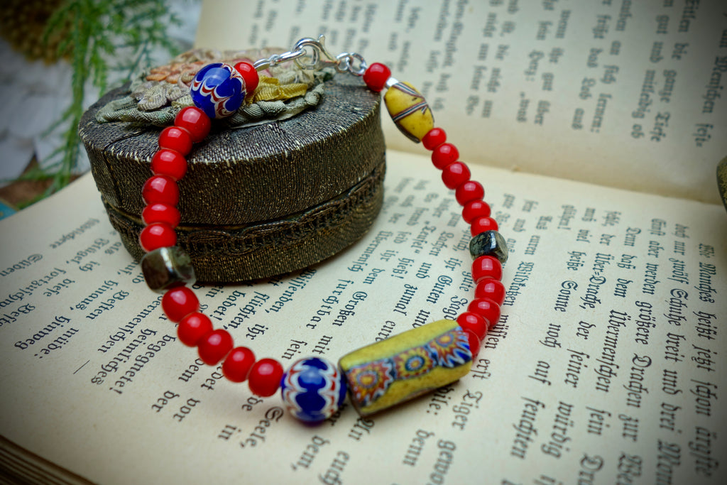 This beautiful bracelet is made with old bohemian glass beads from the 1920s/1930s and Venetian glass pearls which are over 100 years old. Combining bright red color with yellow and blue is eye-catching! Inbetween, two nice Pyrite stones found their place. A timeless 925 sterling silver clasp is holding this bracelet securely on your wrist. The total length is 20cm. Please measure your wrist carefully. You can use a cord or something similar to measure your correct wrist size. The bracelet should fit neither to loose nor too tight. Bead size is approximately 5mm-6mm (red beads) to 10mm (yellow bead in center). It can be worn by women and men.