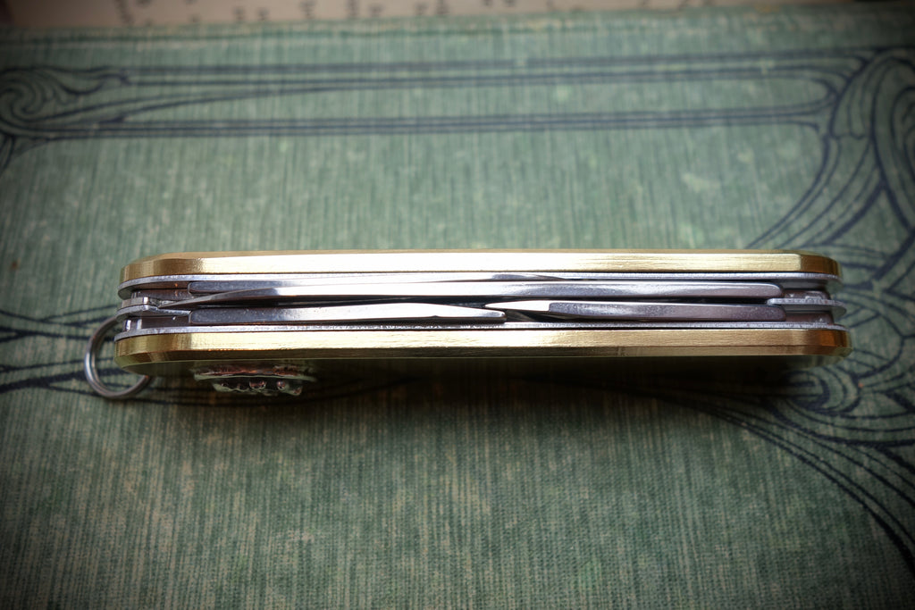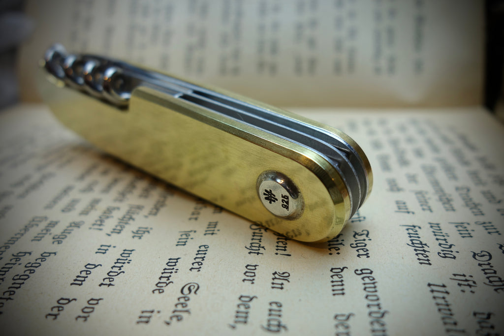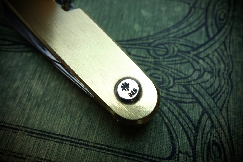Please consider: this knife is quite heavy (about 133 grams) due to the solid brass scales and silver applications.