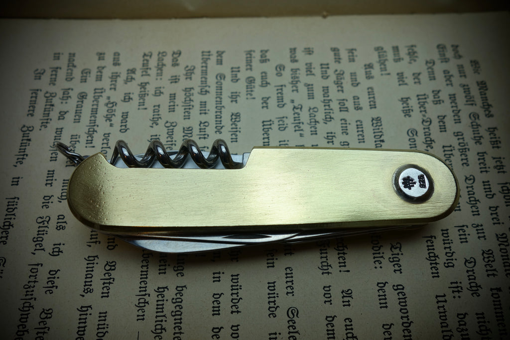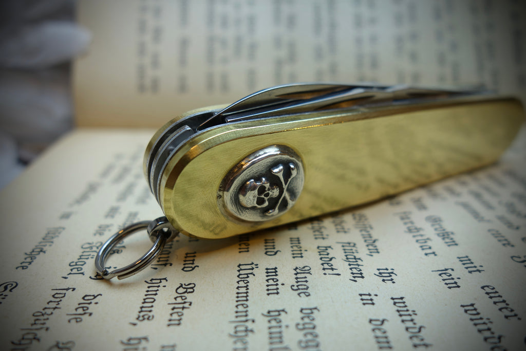 Solid heavy brass scales found their place here and make this knife wonderful to feel and touch. Brass is a wonderful material to work with, especially in combination with sterling silver. The gorgeous small skull with bones and the logo (other side) are made with 925 sterling silver and soldered onto the brass. This special knife is for individualists and collectors.