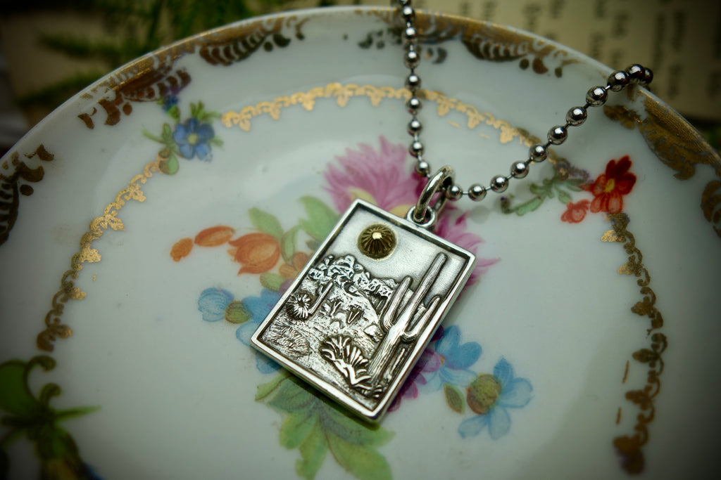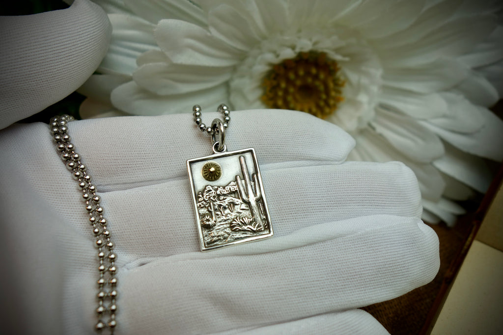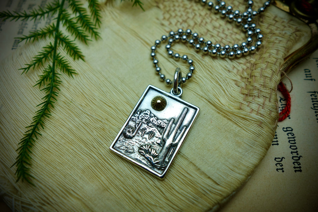 It depicts a classic desert scene with a large beauty „Saguaro“ on the right. The sun (top left) is made with 750 yellow gold (18k gold) and is a real eye catcher! This little bicolor charm is for dreamers and lovers of the American southwest. You will love it. For women and men. Also a perfect gift idea.