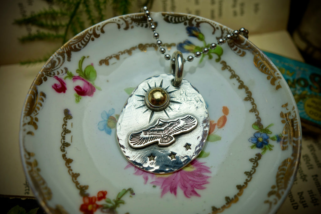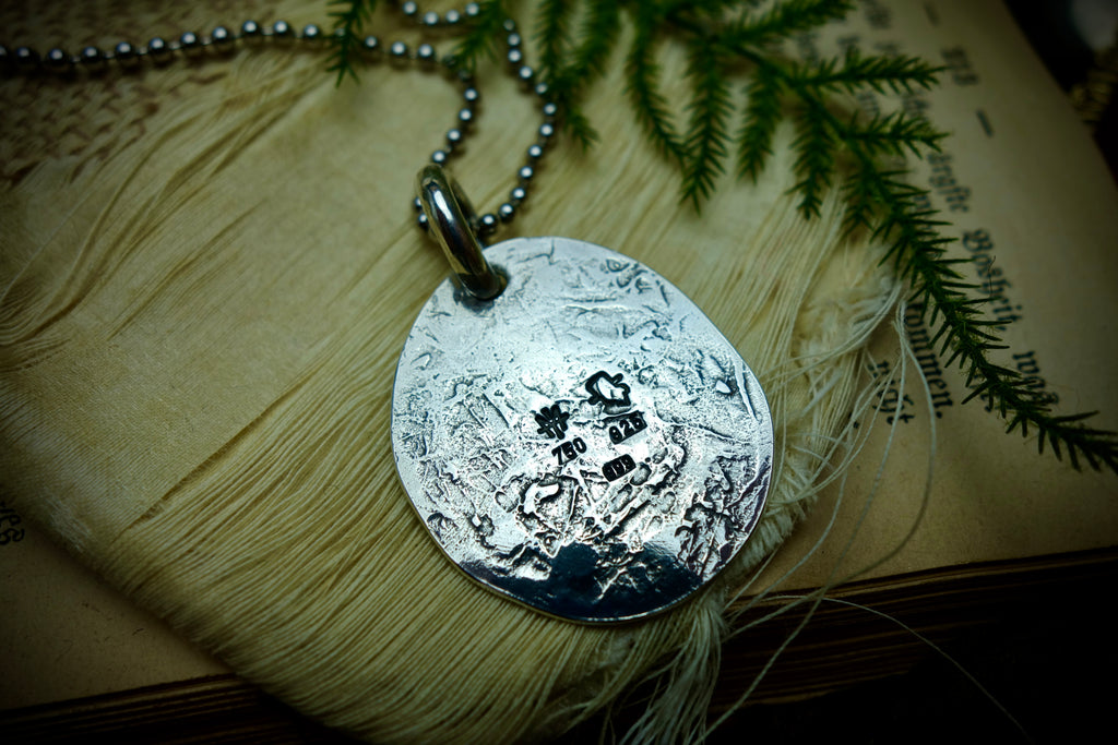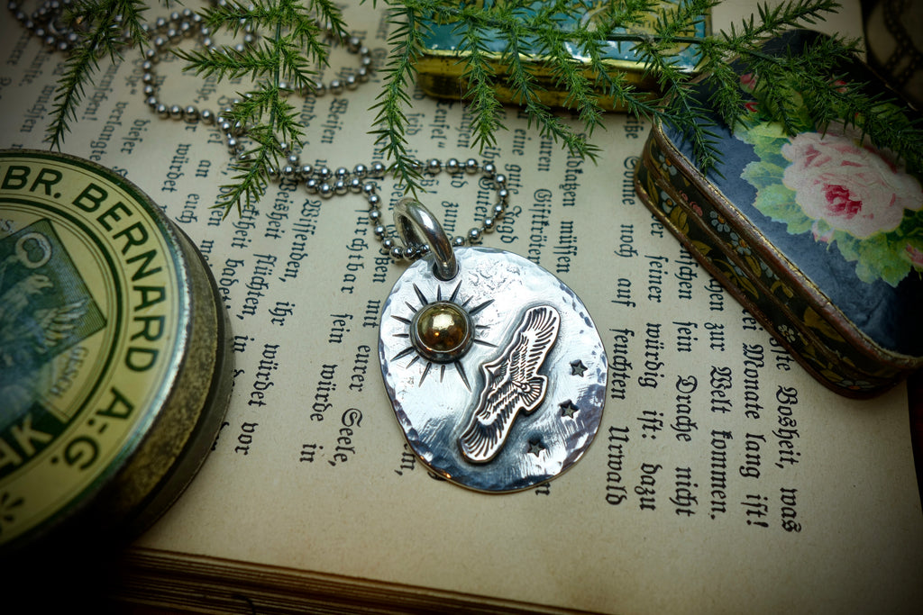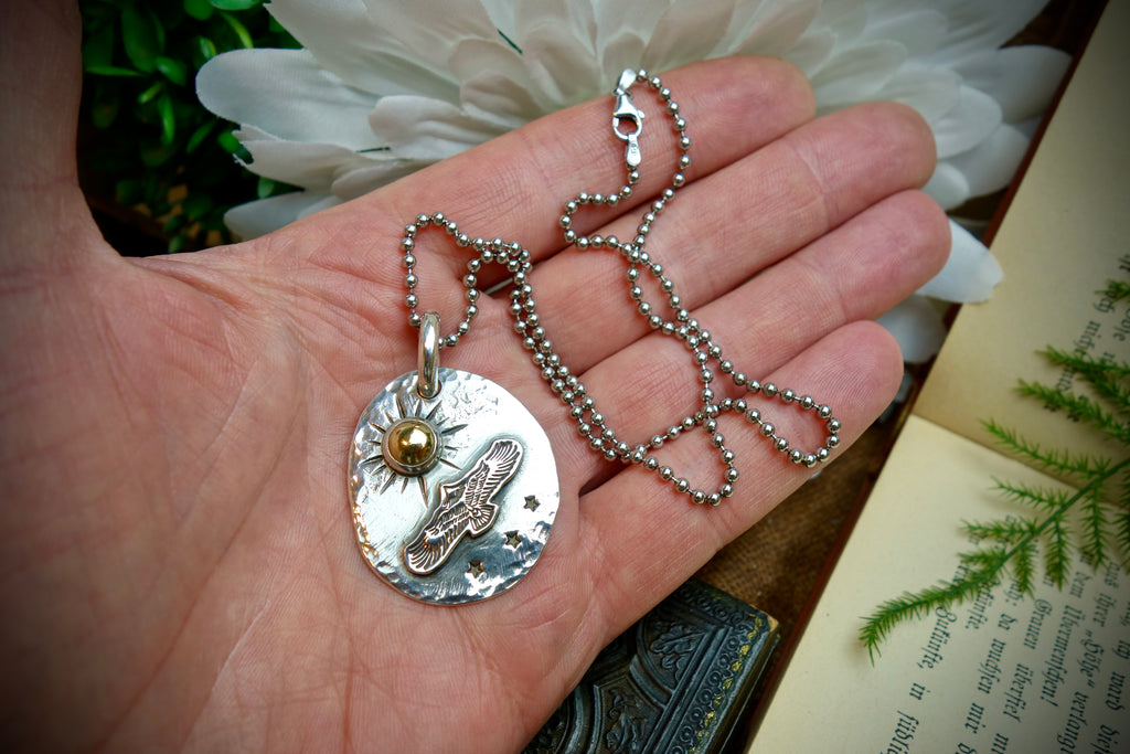 The sun is made with solid 750 yellow gold (18k gold) and is set as a „Cabochon“ (like a stone) into a handmade bezel (fine silver). This is a rare technique to use silver or gold and gives the jewelry piece a very special and unique appearance. The rest of the pendant is made with 925 sterling silver. This dreampiece can be worn by women and men. Wear this heirloom quality piece every day, you will love it. It will be your daily spiritual companion at least for decades.