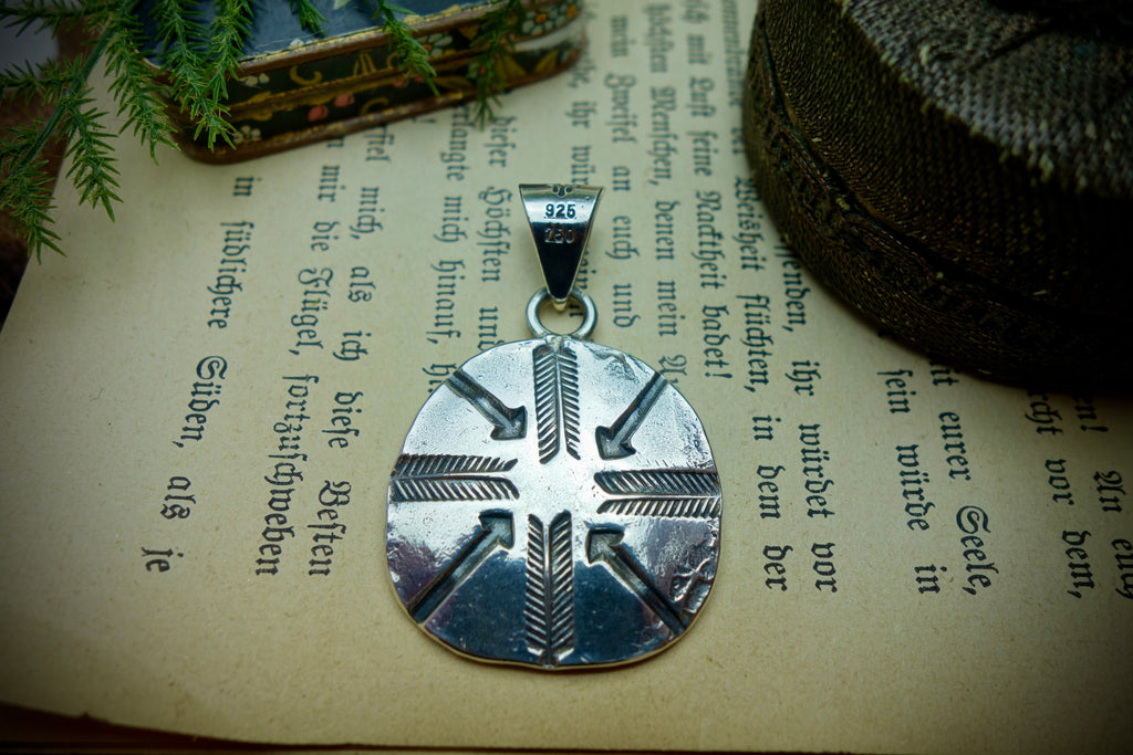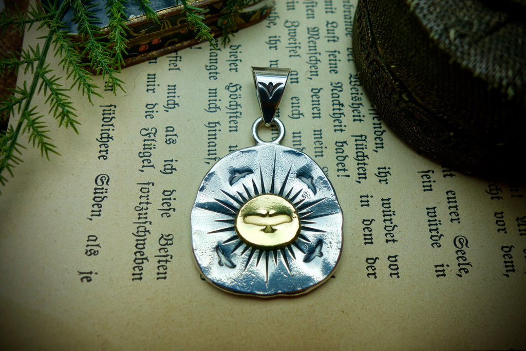 Core element of this pendant is the 750 yellow gold (18k gold) eagle in the center. Four smaller eagles are circling around the big one. Also take a look on the back: it is decorated with beautiful arrows.