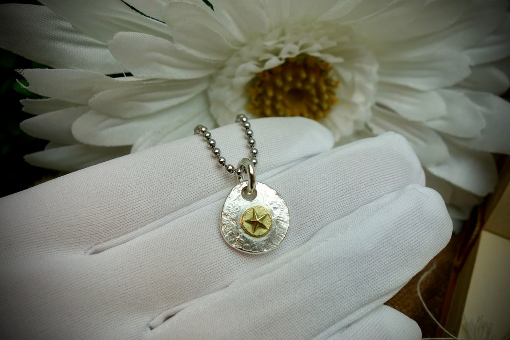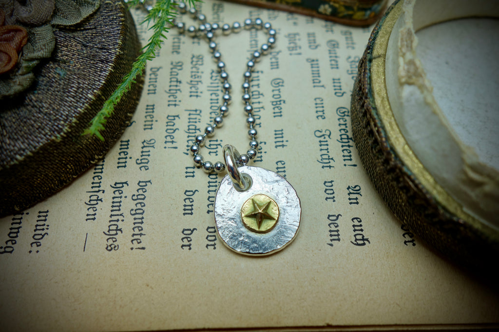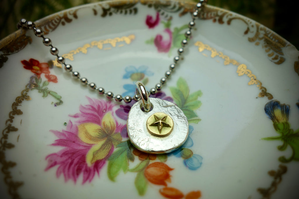 Stars are wonderful symbols with various meanings. The can be our „light in the dark, that guides our way“. Or they help us to keep faith and hope. They also are associated with higher knowledge or enlightenment. No matter what your favorite association is, this tiny bicolor star pendant will bring you joy and will make you smile. This lovely little treasure is also a great gift idea for a beloved person or friend. The star is made with solid 750 yellow gold (18k gold), the rest of the pendant is made with 925 sterling silver.