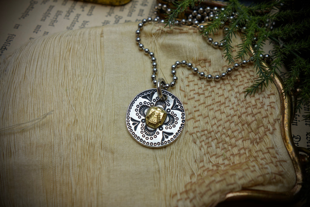 This is a very tiny Thunderbird, made in solid 750 yellow gold (18k gold). Perfectly sized for your everyday wear. The sterling silver medal got some very beautiful ornaments, timeless and traditional in design. Thunderbirds are old spiritual symbols of power, protection and spiritual guidance. Both women and men love these and integrate them in their daily lifes.
