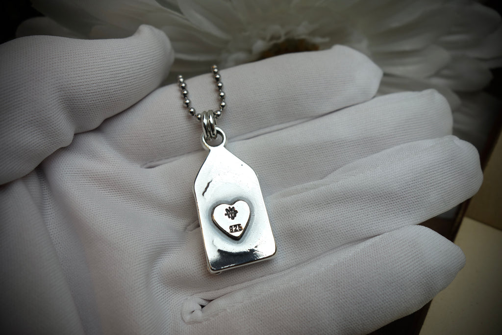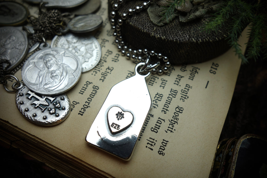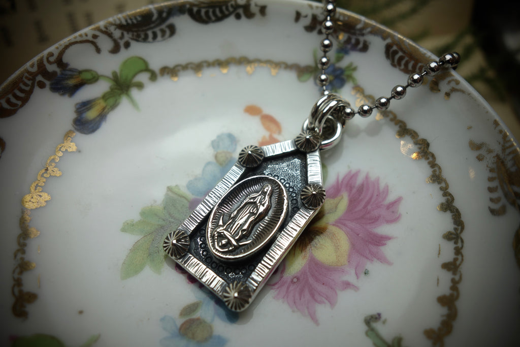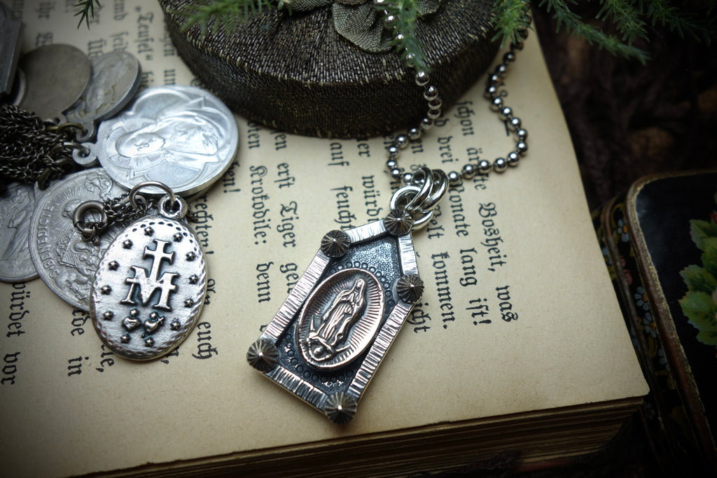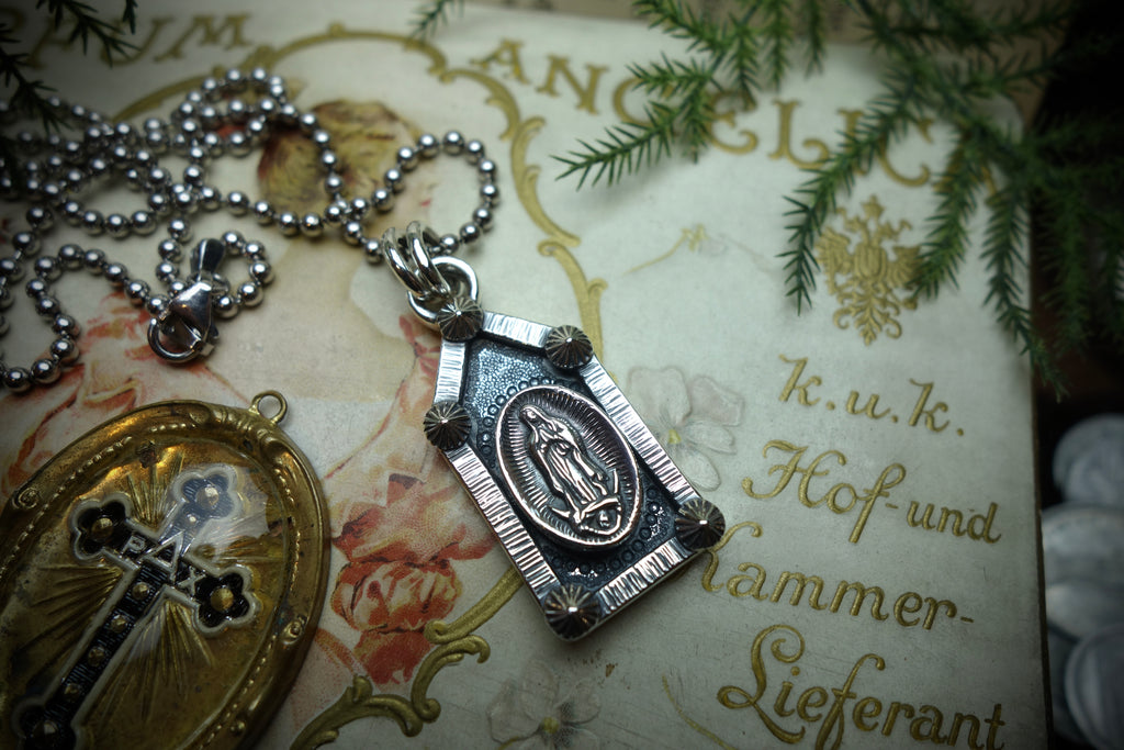This spiritual talisman was made in reminiscence of old icons and retablos. It depicts a small version of the „Lady of Guadalupe“, which is famous in Mexico and one of the most beautiful symbols. So if you are searching for a spiritual companion for your everyday wear, this pendant might be your choice. It has a very beautiful weight and size and can be worn by women and men. It might look great on a longer chain, but that is your personal taste.
