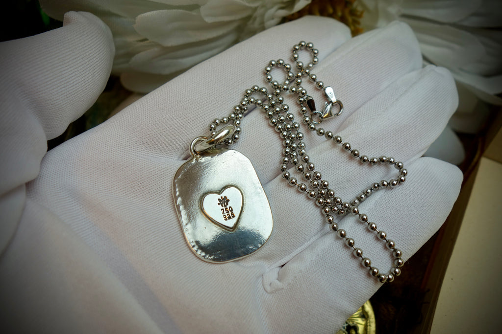 The measurements are approximately 29mm (hight without bail) x 23mm (width) x 1,5mm/3,5mm (thickness silver plate/with gold eye and silver heart on the back). The chain is NOT INCLUDED, you can order it separately in your desired length.