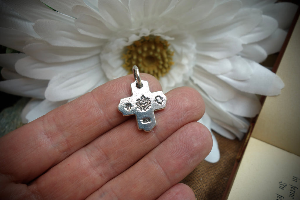 Very happy to offer this beautiful sterling silver cross again. It is an old shape and form. In the center is a wonderful tiny sacred heart. I also stamped one on the backside of the pendant. This is a wonderful spiritual talisman or gift for a beloved person or for yourself. Wear it together with other jewellery or just alone.