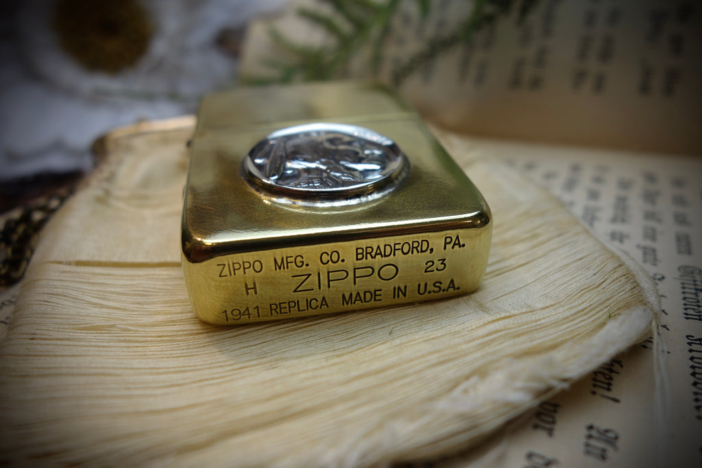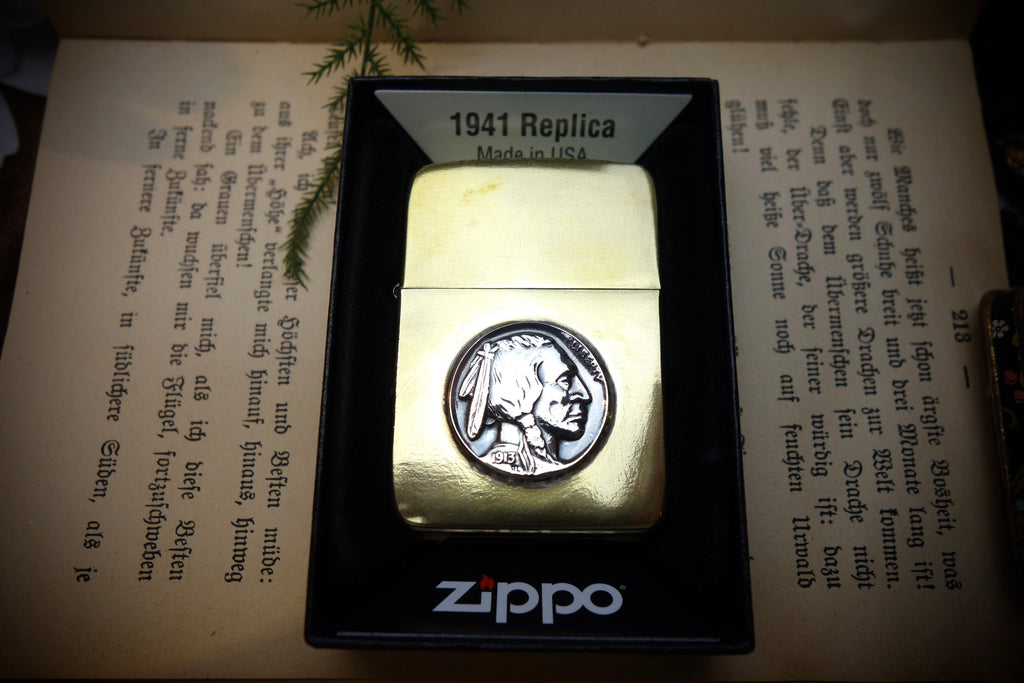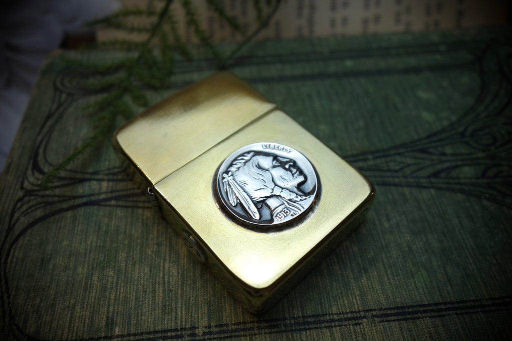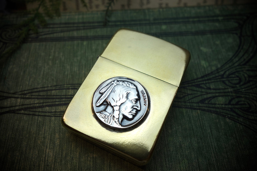 This is an original Zippo 1941 Replica brass lighter. The front is decorated with a coin-like „5 Cent“ embellishment in 925 sterling silver. These coins were minted in the USA from 1913 till 1938. The „Indian Head“ is an iconic image in the American coin history and very beautiful. Zippo brass lighters will oxidize and age over time. This process is natural and will give each lighter its personal patina and beauty. Zippo lighters work with classic „lighter fluid“ (not included) and have to be refilled regularly, depending on use. They work best if used daily or at least regularly. The perfect item for smokers or collectors. The lighter is new, empty and has never been filled. Please note, that NO OVERSEAS SHIPPING is possible. Shipping only within the E.U. Thanks for your understanding.